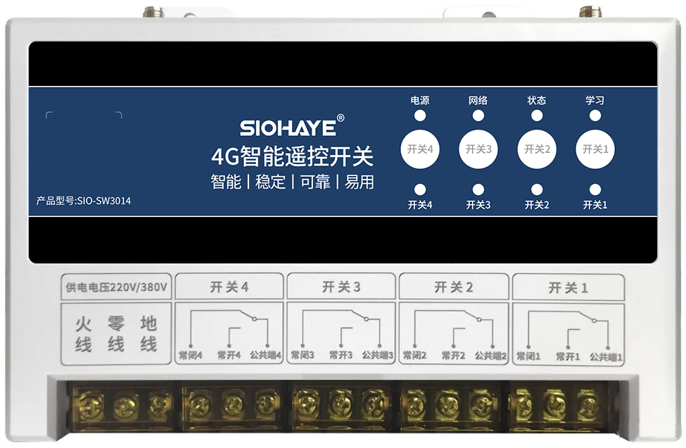 SIO-SW3104 是本公司自主研發(fā)的遠程遙控開關(guān)。支持4G網(wǎng)絡(luò)和本地433遙控器2種方式控制。能夠?qū)崿F(xiàn)遠程控制,遙控器控制,本地按鍵控制。支持自動、任務(wù)、定時任務(wù)、輸入聯(lián)動、斷電報警等高級功能,設(shè)備支持標簽定制,硬件定制,APP私有化部署等高級方案。